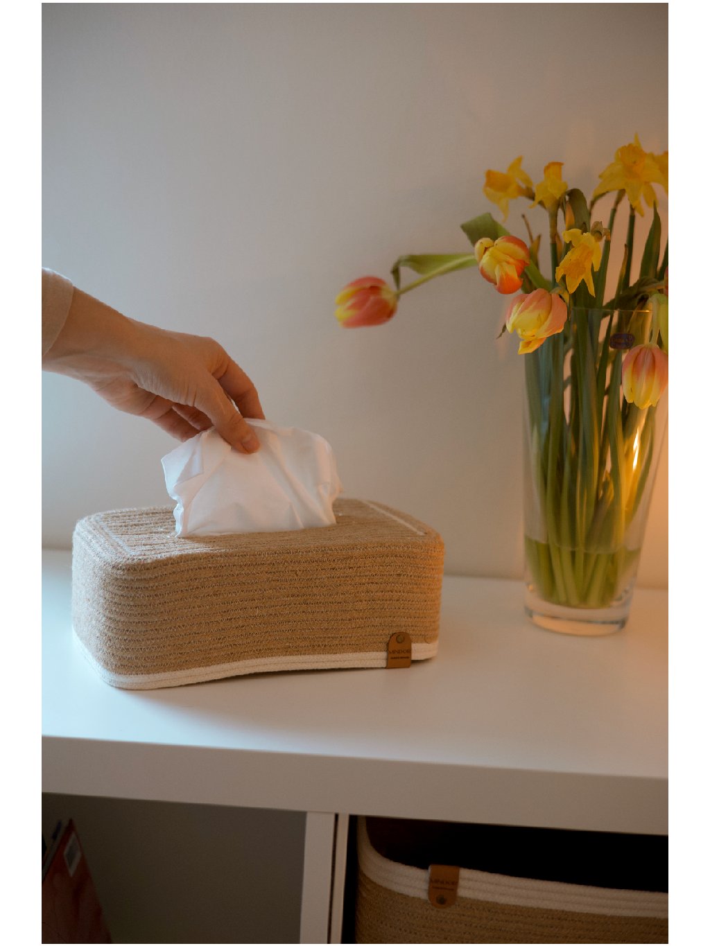Jutový box na kapesníky je důkazem, že i praktické věci mohou být estetické. Díky přírodnímu vzhledu juty působí elegantně, zemitě a útulně zároveň. Krásně ladí s ostatními doplňky z juty – v koupelně, ložnici, obýváku i na pracovním stole. Schová nevzhlednou papírovou krabičku, a přitom vytvoří harmonický detail, který do prostoru vnese klid a řád.