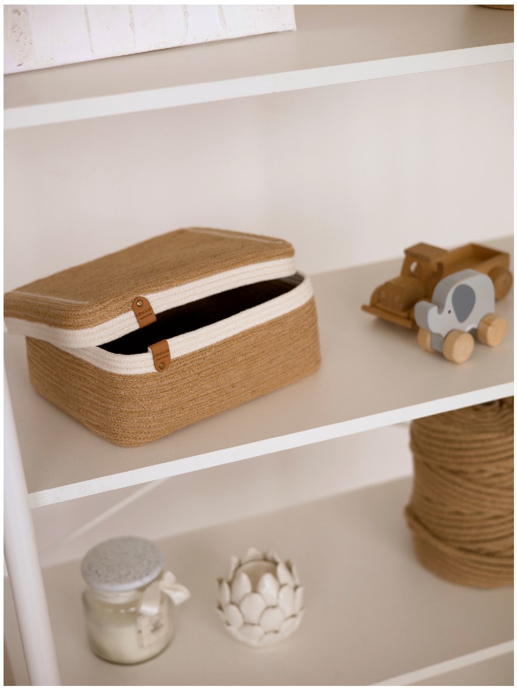 Elegantní jutový košík Calime s bílým bavlněným lemem – krásný a praktický kousek pro ty, kdo milují jemnost, přírodu a pořádek.