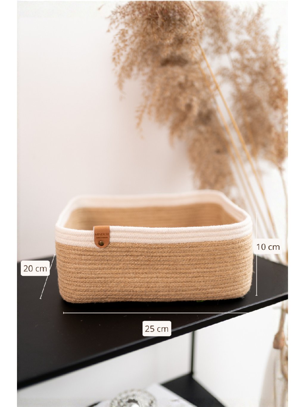 Košík z juty Calime je ideálním pomocníkem do koupelny, ložnice nebo předsíně. Bílý bavlněný lem mu dodává lehkost a eleganci – jemně podtrhne světlý, přírodní nebo minimalistický interiér. Využijete ho na kosmetiku, ovladače, nabíječky, šály, dobrůtky pro hosty nebo třeba na skladování drobností, které chcete mít hezky po ruce.