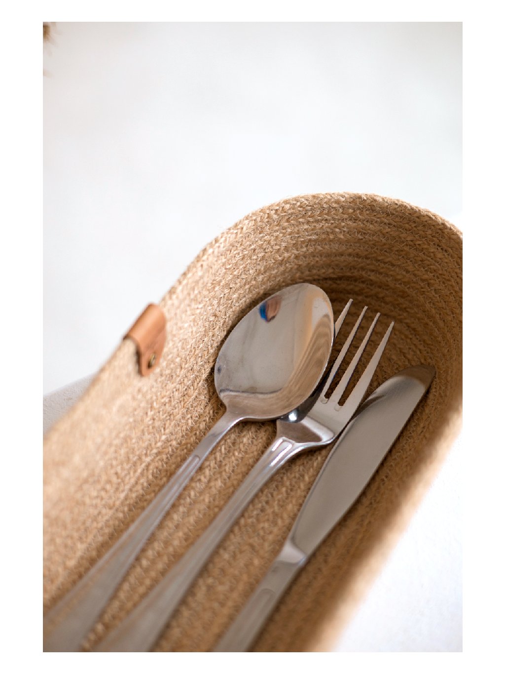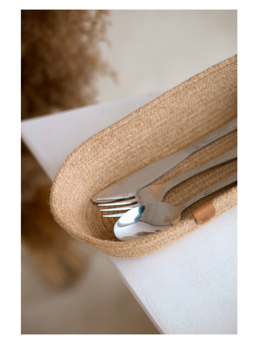 Praktický jutový košík na příbory, který udrží pořádek na stole a zároveň ho jemně zútulní přírodním materiálem.