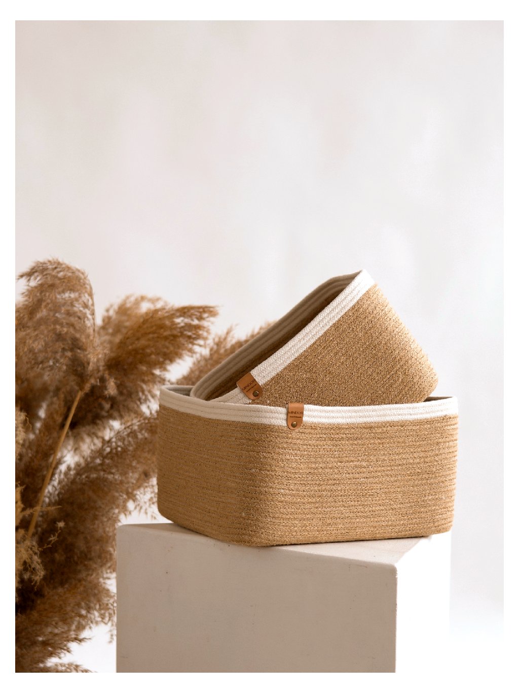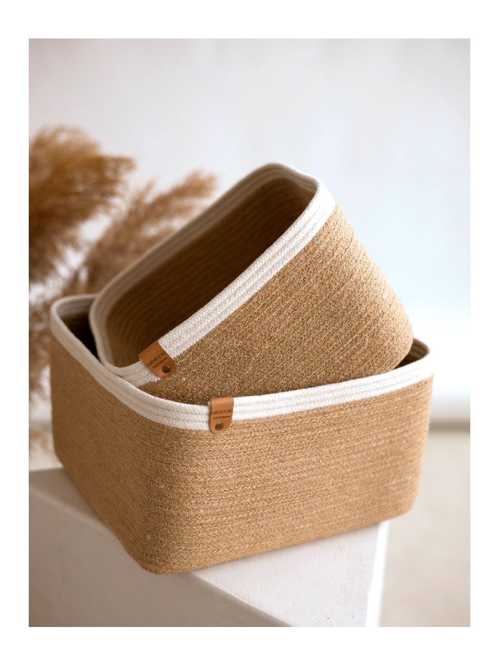 Sada dvou jutových košíků s bílým lemem přinese do domova přirozený řád, klid a harmonii – praktický jutový doplněk, který zútulní každý kout.