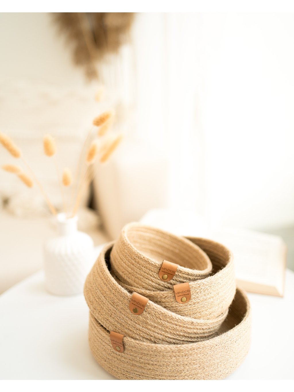 Sada 4 košíků ALMION je stylovým a praktickým organizérem, který přinese řád i útulno do Vašeho domova. Díky různým velikostem nabízí ideální prostor pro uložení klíčů, kosmetiky, šperků i jiných drobností. Vyrobené z 100 % přírodní juty působí jemně, přesto pevně a odolně, a krásně doplní moderní i přírodní interiér. Každý kus je ručně šitý v malé moravské dílně, takže je nejen praktickým pomocníkem, ale i originální dekorací.